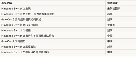 根据《NintendoSoup》统计My Nintendo Store 美版网站上信息指显示,多数Nintendo Switch 2商品标明制造地为越南或柬埔寨,预期受美中关税大战的影响有限。虽然单独销售的主机未明列产地,但外界推估市场初期70%至85%的供应量,将来自越南生产的马里奥赛车同捆包,降低受到关税影响的可能性。反观中国制配件多属非关键性的周边产品,包含携行包、保护贴与电源供应器等,配件虽中国制造,但属于可轻易替代的消费性周边,对消费者冲击并不大。
