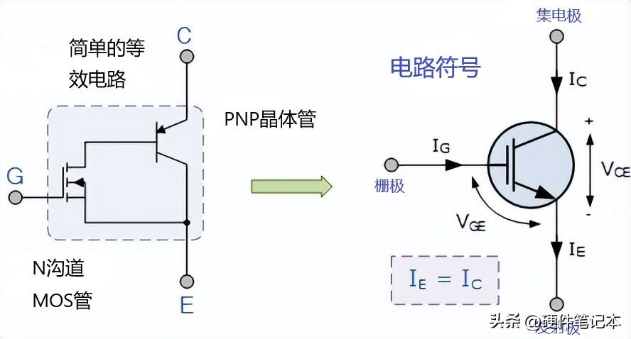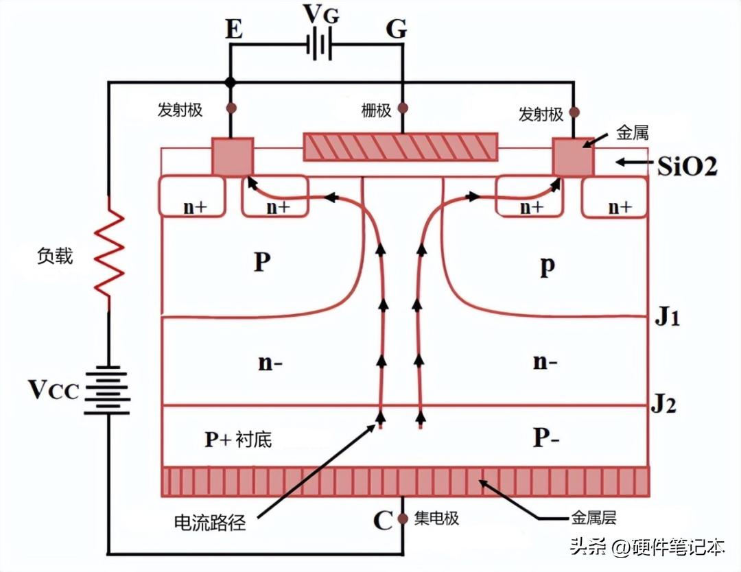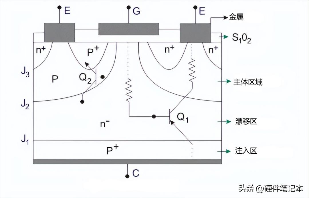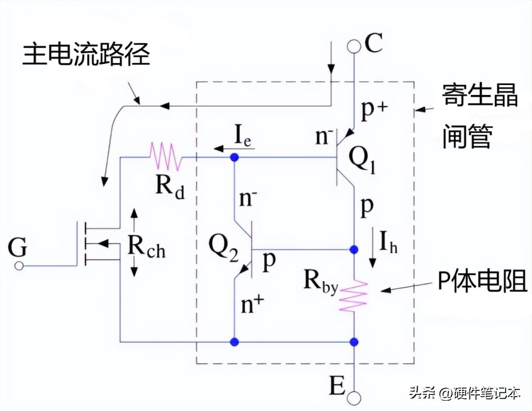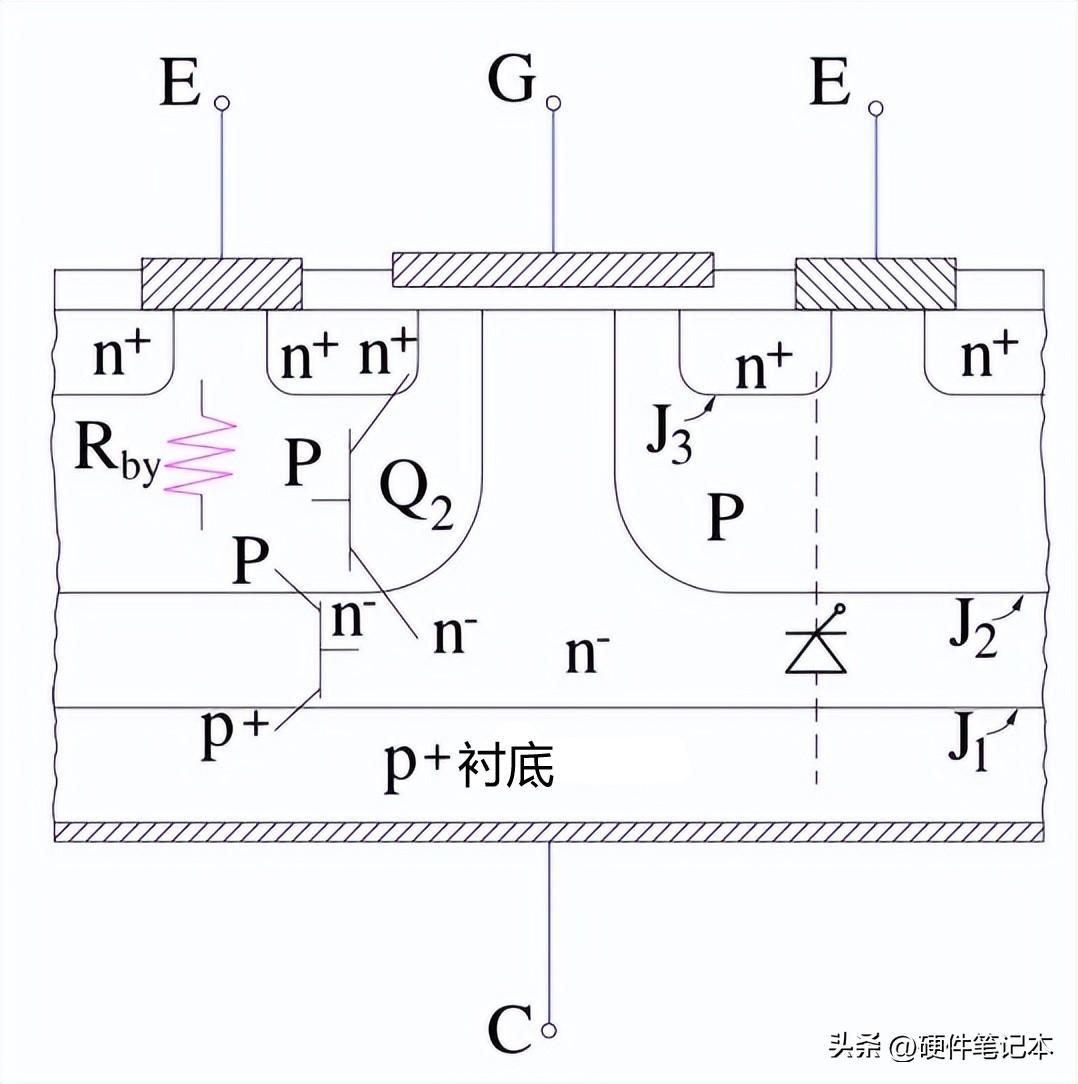 仔细检查 IGBT 的基本结构,可以得出这个等效电路,基本结构如下图所示。