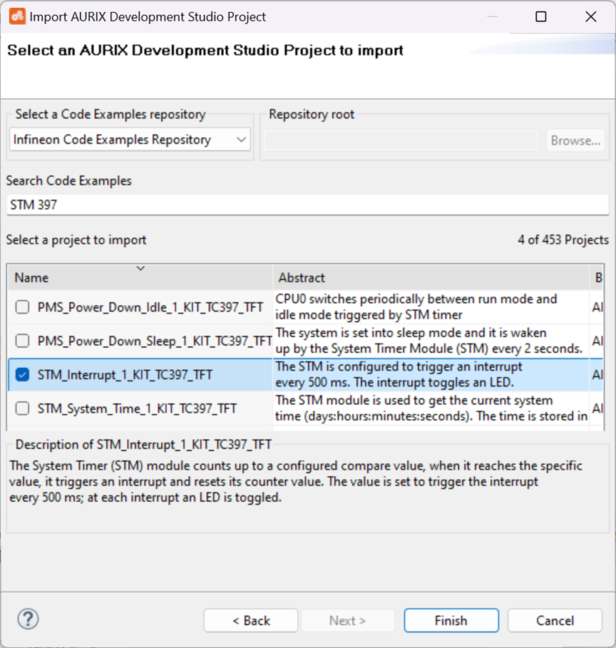 安装完成之后,用户可打开 ADS平台,在 File 菜单中选择 Import 导入,之后在例子工程的代码库中找到名为 STM_Interrupt_1 的例子工程,点击 Finish 完成,即可导入第一个例子工程。 (注:TC397的工程可以使用在TC399的开发板上)。