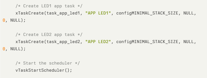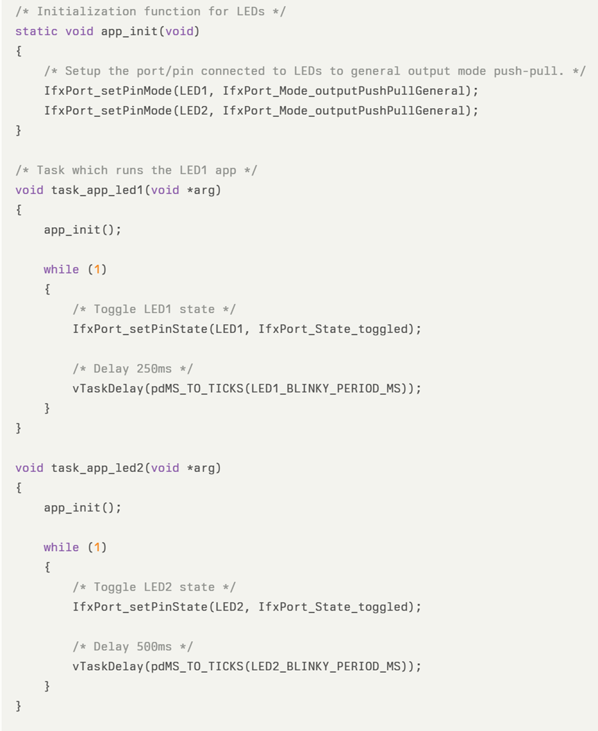 在 Cpu0_Main.c 中,主要创建了2个任务 task_app_led1 和 task_app_led2,并启动操作系统的调度器,代码如下:
