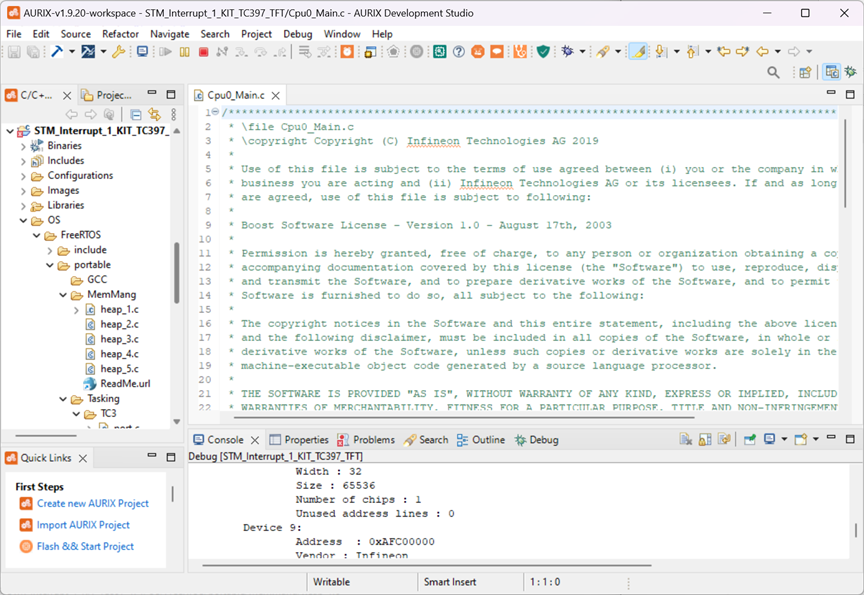 打开工程后,可以在工程上点击右键,选择 Set Active Project,之后点击 Build Project 进行编译。编译之后,点击 Debug菜单进行下载调试。如果在Debug Configurations中没有合适的配置,请首先创建一个配置(使用默认配置在TASKING C/C++ Debugger中创建即可)。这里注意,编译前需修改 STM_Interrupt.c 文件中的 LED 引脚为 P33.4,以适配 TC399 Triboard 的 LED1 引脚。下载后,点击Resume运行,可以看到开发板上最左侧的LED灯会闪烁。这个工程是我们进行 FreeRTOS 移植的基础。