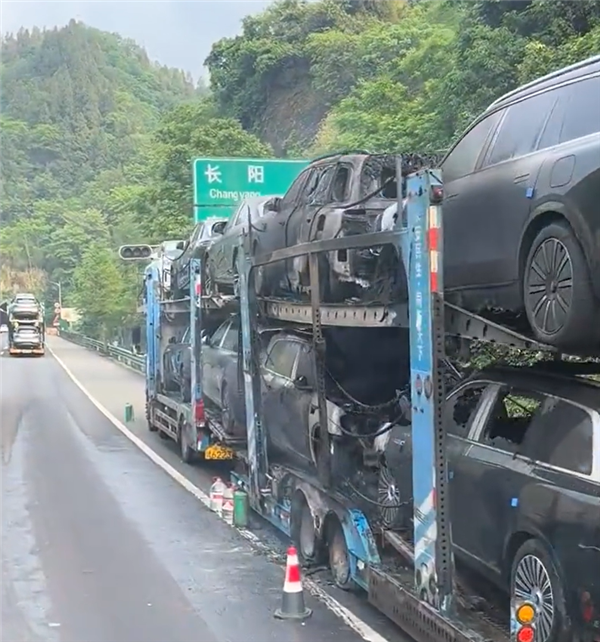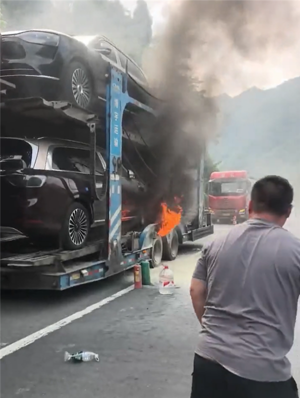 网友:能用水浇灭,证明根本没有烧到电池,M9的安全性确实值得肯定;估计是长下坡路段,司机频繁踩刹车导致温度过高引燃了轮胎,最终烧到了这些拉的这些新车。