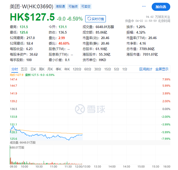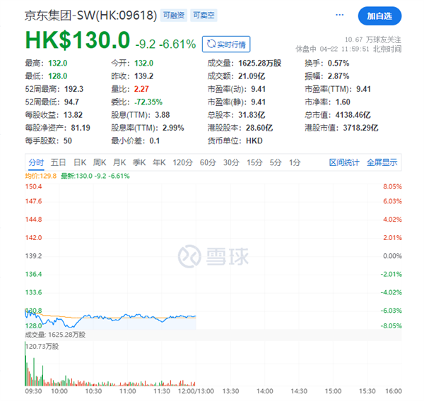 截至4月22日上午港股收盘,京东集团-SW股价跌幅达6.61%,市值蒸发近300亿港元;美团-W跌幅达6.59%,市值蒸发近600亿港元。