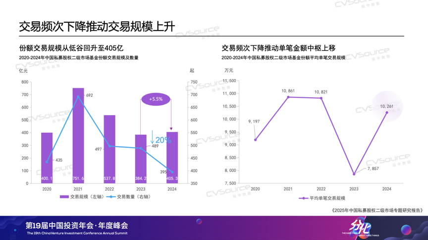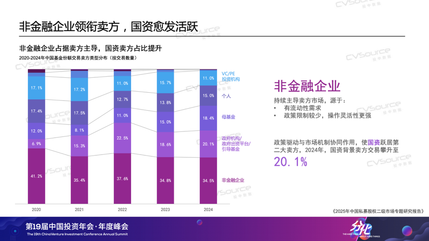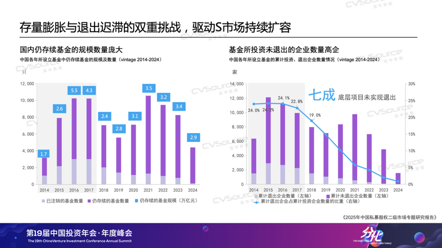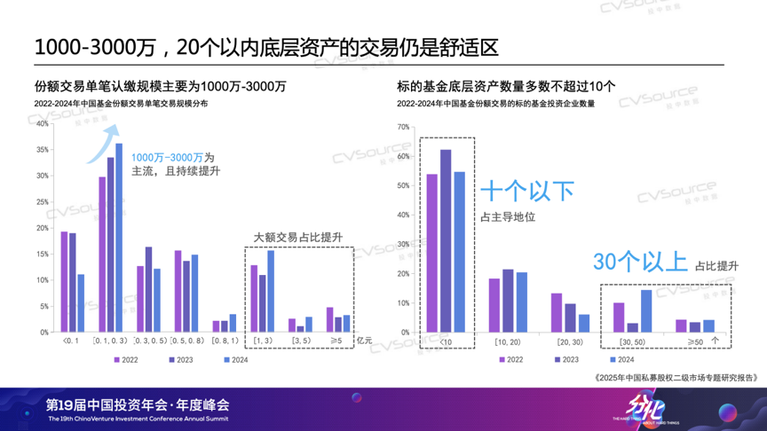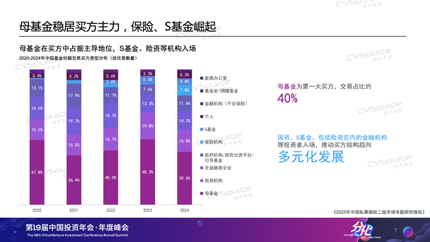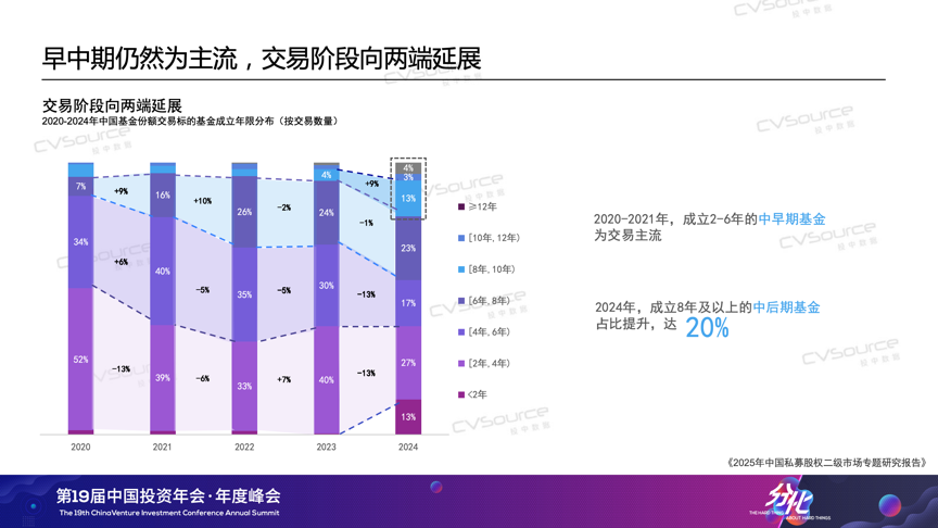当前,中国私募股权市场正经历“存量时代”与“创新升级”的双重考验,产业变革正催生强烈流动性需求,S市场的战略价值正以前所未有的速度被激活。例如低空经济领域,eVTOL技术突破带动产业链融资激增,但长周期硬科技项目普遍面临8-10年投资回收期,LP对流动性工具的需求空前迫切;AI领域,2024年全球相关投资额达1200亿美元,早期美元基金却因份额到期亟需通过S市场实现跨周期承接。因此在政策端,北京、上海等多地开始陆续出台S基金管理细则,推动S市场从“散点探索”迈入制度建设阶段。那么到2025年,我们的S市场来到了一个什么样的阶段?我们的S市场出现了什么样的新趋势?买卖双方的画像与偏好是否出现了新的变化?4月18日,在“第19届中国投资年会·年度峰会”上,投中信息副总经理、研究咨询事业部总经理吴浠分享了最近的《2025年中国私募股权二级市场专题研究报告》。以下为现场实录,由投中网进行整理:各位参会的嘉宾、各位线上嘉宾,大家好,我是投中研究咨询事业部吴浠。非常荣幸和大家在周五的上午相聚在海淀,相信大家在两天的脑力劳动后一定是收获颇丰,也希望我们今天分享的报告——《2025年中国私募股权二级市场专题研究报告》——能为大家补充一些S方面可以参考的数据及洞见。投中研究院从2018年开始研究S市场,算是国内最早一批研究S市场的机构。时间过去了七年。我们观察到S市场、S交易在国内从一个新兴事物逐渐成长为价值受到各方认可的私募股权交易方式,S策略、S基金的打法亦逐渐成熟,到今天,S市场已成为国家大力发展的私募股权市场的重要组成部分,也成为市场退出、投资人多样化配置化策略的重要选择。首先,大概介绍一下今年将要发布的报告研究对象。正式版的报告分为两个部分,第一部分是数据方面的研究。这部分口径主要会关注LP份额类的交易。大家可以看到我们研究范围包括了比较复杂的资产交易,因为我们今年调研到了市场头部的十多家买卖双方、以及监管方、平台提供方,大家给我们提供了非常多复杂交易的案例,所以在后面的案例部分,会有复杂交易案例出现。整体使用到的数据,其实就是嘉川CVSource数据库,包括一些公开的新闻以及企业的发布,同时我们应用了大数据,以及人力的方式去识别出真正我们认为是份额交易的事件。首先我们来分享一下数据层面的情况。从2021年-2024年S市场的交易是处于下降的趋势,交易事件也在下降,交易规模我们统计到2024年虽然有一定的回升,但整体这个趋势是在下行的。如果大家有时间看一下投中发布的整体VC/PE市场的投资情况,可以发现S交易是跟VC/PE整体的交易趋势比较一致的。为什么提到这点呢,因为在很多年以前写这个报告的时候,我们曾经认为S市场可能会跟VC/PE市场是一个互补的状态。因为我们都知道,经济环境不好的时候可能会更容易达成交易,这是我们惯常的理解。但是现在我们理解这种一致性趋势,整体的行业的宏观发展也会对S基金的募资和退出造成比较直接的影响,导致它们的一致性。特别是我们看到2024年整体的交易事件有20%的下滑。交易规模虽然有一定的上升,但其实打开底层数据的时候,我们发现很多发生在2024年的交易是比较大额的交易。把这些交易剔除掉之后,剩下的交易规模也是在下降的,这是我们观察到的整体交易的趋势。从整体交易份额的认缴规模的区间来看,我们发现1000万-3000万还是比较主流的交易规模,整体占比在30%以上,并且今年整体是上升的趋势。下降比较严重的是小于1000万的份额交易,2024年我们也观察到比较大额的交易,一个份额大于1个亿的交易也是在上升的。前两年,我们就跟部分的S基金的管理人有沟通过,规模比较小的管理人当时就已经开始倾向于去寻找这种大的资方,共同去接一些比较大的份额,避免错失这样的投资机会。从这些交易份额所涉及的底层交易的项目数量来看,2024年整体的交易还是集中10个以下的份额居多。我们跟刚才提到的十家机构调研的时候也发现,买方的舒适区还是在30个项目以下的份额。因为往上的话,对他整体的人员尽调精力和整体需要的尽调时间就会大大的延长,但是S交易是一个窗口期比较短的交易,所以会出现这样的情况。但是我们同时也发现2024年的数据,30个以上份额的交易占比是在上升的。如何理解这一现象呢?我个人理解这可能主要是两个原因:第一,由于大家对于确定性的需求会更多的去交易这种尾盘,偏更明池的份额目;第二,随着时间的演进,很多早年间在基金规模上升年间设立基金纷纷进入退出期。随着这些基金规模的增大,即使我们不调整投资策略,基金规模的增大也会带来底层项目的增加。所以,可能买方未来需要去考虑的事情是,在这样一个底层项目会持续增加的趋势中,我们如何在未来更好地去安排,实现我们控制整体尽调的成本和人员的成本。这张图介绍的是交易这些份额对应的基金成立的时间。现在大家对投资确定性的要求越来越高。以2020年为例,当时大部分交易集中在成立2-6年的基金,属于早中期基金。但今年的趋势有所变化,基金交易的生命周期往后推移,2024年有20%的交易项目来自成立8年以上的基金。同时,成立小于2年的早期基金交易占比也有所上升。深入了解后我们发现,很多这类交易是国资关联主体之间的转让,严格来说,这类交易市场化程度不高