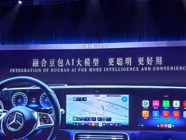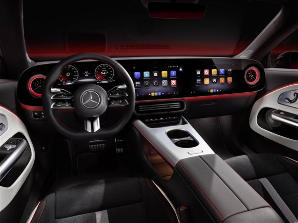 内饰方面,中控台采用了三连屏式设计,由10.25英寸液晶仪表和14英寸中控屏以及14英寸副驾娱乐屏组成,内置奔驰最新的MB.OS操作系统,并融合了豆包AI大模型,还可选装12.2英寸HUD抬头显示屏。