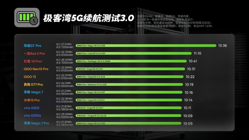 据了解,在此次合作中,京东积极组织用户与荣耀产品团队进行面对面交流,将用户的真实声音、具体诉求直接传递给了荣耀产品经理和开发工程师,也因此共同推动了这块7200mAh超大电池的“诞生”。而在极客湾Geekerwan、小白测评等头部媒体发布的续航评测榜单中,荣耀GT Pro也凭借着这块超大电池、超强芯片技术带来的超长续航强势霸榜。