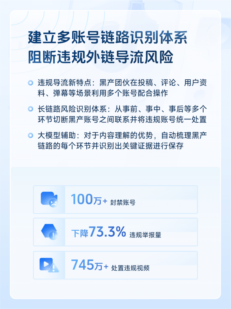 为了解决此类难题,抖音平台搭建了多个账号长链路的风险识别体系,从事前、事中、事后等多个环节切断黑产账号之间联系并将违规账号统一处置,同时结合大模型对于内容理解的优势,自动梳理黑产链路的每个环节并识别出关键证据进行保存。在AI技术的深度运用下,一季度站内相关违规的举报量下降了73.3%,平台封禁导流违规账号近100万个,处置违规视频内容745万条,并将线索上报相关部门,配合打击违规导流团伙。