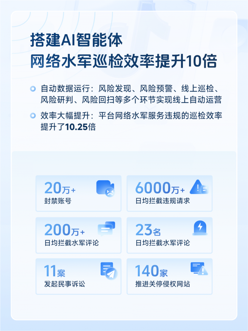 在今年第一季度的试运行中,平台网络水军服务违规的巡检效率提升了10.25倍,日均拦截违规请求6000万次,封禁水军账号超20万个。