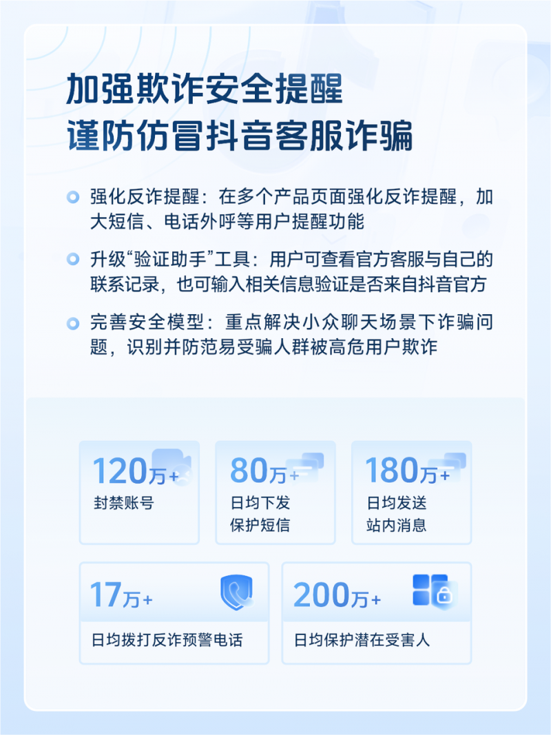 2025年至今,抖音共封禁欺诈相关账号140万个,每日下发提醒短信超80万条,拨打反诈预警电话近17万次。