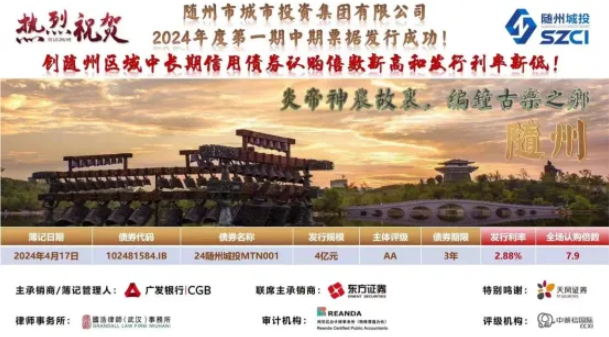 24随州城投MTN001:双创新纪录赋能发展。2024年4月17日,天风证券参与分销的随州市城市投资集团有限公司2024年度第一期中期票据成功发行,募集资金总额4亿元,期限为3年期,发行利率2.88%。本期债券全场认购数高达7.9倍,创随州区域中长期信用债券认购倍数新高和发行利率新低,进一步降低了发行人融资成本。