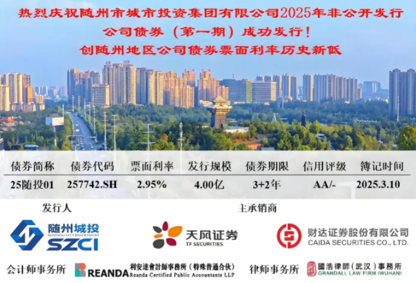 25随投01公司债:利率新低优化融资结构。2025年3月10日,天风证券主承销的随州市城市投资集团有限公司2025年面向专业投资者非公开发行公司债券(第一期)成功发行,募集资金总额4亿元,期限为5(3+2)年期,发行利率2.95%。本期债券票面利率创随州地区公司债券发行票面利率历史新低,发行获得了众多投资人的高度认可,各类投资机构积极参与申购,其中非银资金占比超过70%。此次债券成功发行,对随州市城市投资集团有限公司意义非凡:一方面,为发行人开辟了更为广阔的融资路径,有效优化了发行人的融资结构;另一方面,显著降低了发行人融资成本,减轻了财务负担。与此同时,随州城投在资本市场的品牌形象和市场影响力也得到进一步巩固与提升,为发行人未来的发展奠定了坚实基础。
