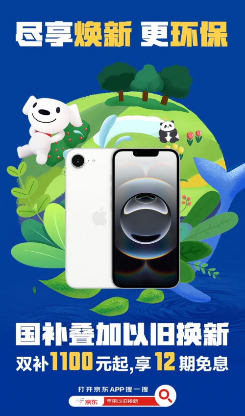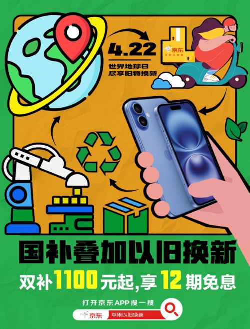 2025年4月22日是第56个世界地球日,今年的主题是“珍爱地球 人与自然和谐共生”。 为推动社会实现可持续发展,京东携手Apple推出绿色焕新特别活动,通过加磅以旧换新补贴力度,推动绿色消费,助力资源循环利用与可持续发展。此次活动覆盖iPhone、iPad、Mac、Apple Watch及配件等全线Apple产品,其中iPhone可享以旧换新补贴叠加“国补”的“双补”优惠,补贴1100元起,还可享受12期免息。消费者只需打开京东APP搜索“苹果以旧换新”,即可一键直达活动会场。