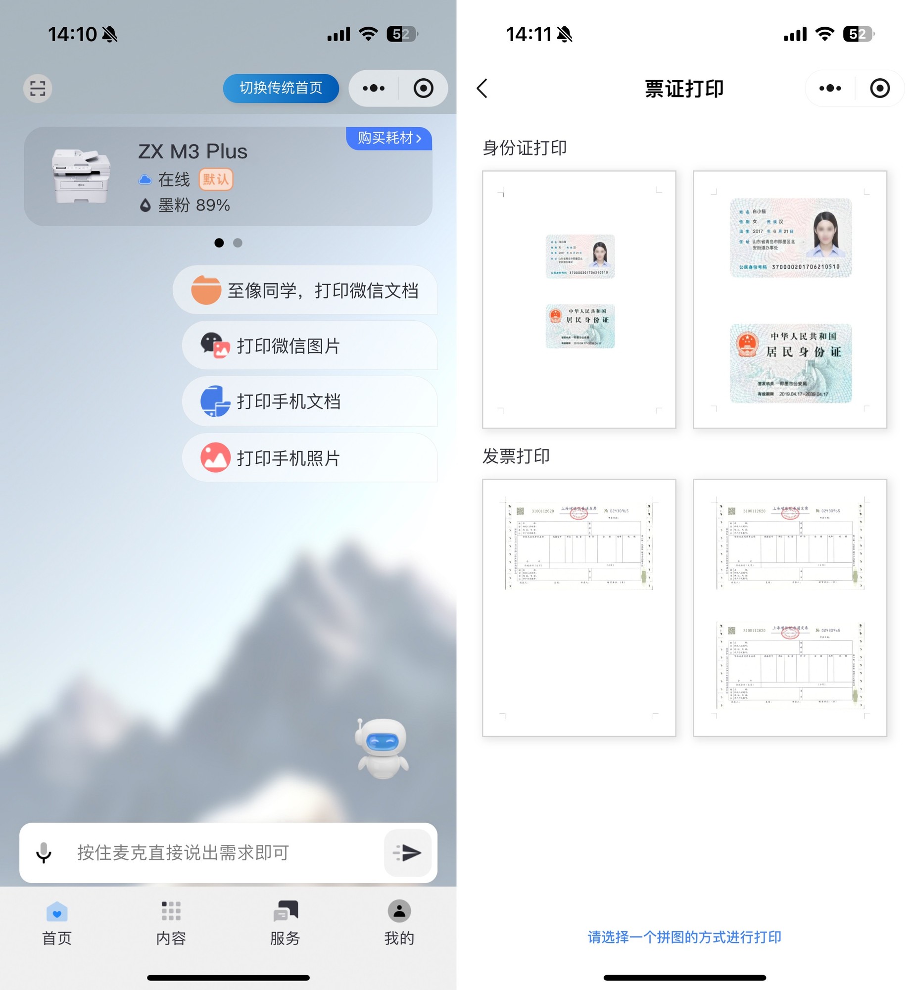 由于小程序可以直接读取到微信聊天记录中的文档,日常在打印时会更加直接。并且这款一体机还支持AI语音控制,按住麦克风直接说出打印需求即可,智能化的交互体验让办公效率事半功倍。