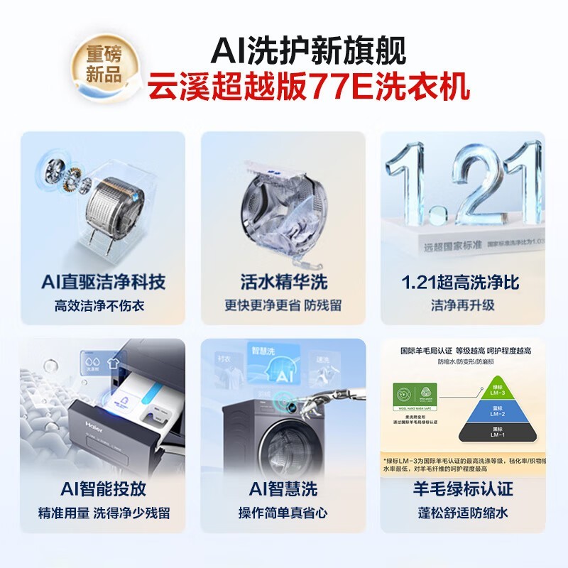 海尔77E滚筒洗衣机精华洗2.0超薄平嵌设计羊毛绿标认证