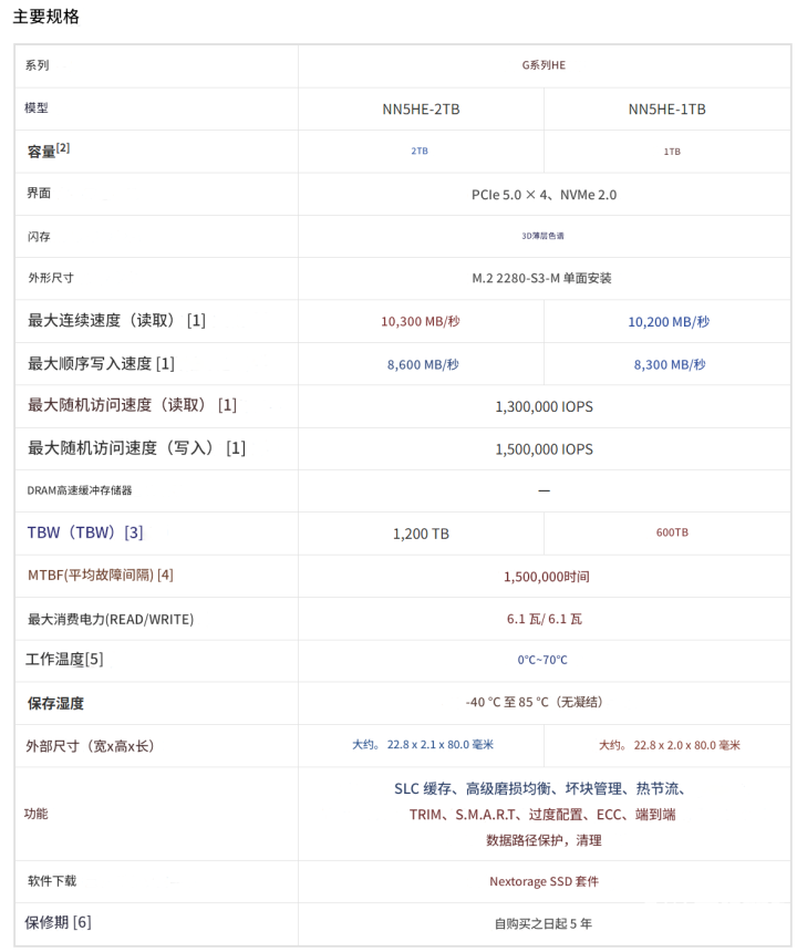 G系列HE SSD采用了行业标准的M.2 2280规格,支持PCIe 5.0 x4通道,提供了1TB和2TB两种容量可选,顺序读取和顺序写入速度最高分别为10300 MB/s和8600 MB/s,另外随机读取和随机写入最大均为1300K IOPS和1500K IOPS,1/2TB的TBW分别为600/1200,MTBF为1,500,000小时。