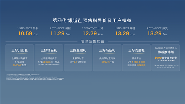 快科技4月22日消息,吉利新款博越L(官方称为第四代)正式开启预售,共5款配置车型,预售价为10.59-13.29万元。