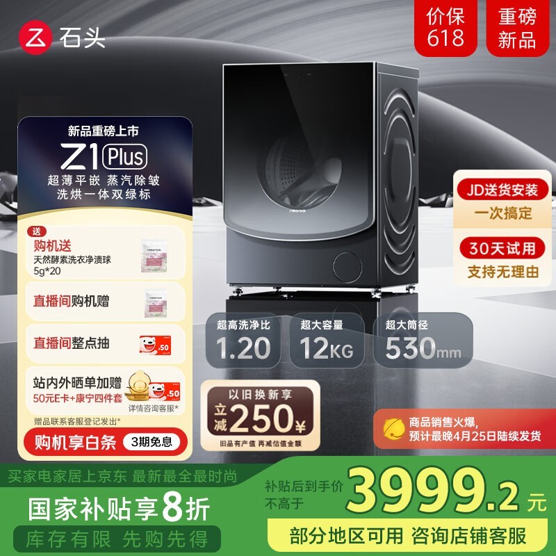 石头分子筛洗烘一体机Z1 Plus 12kg京东促销到手价3701元