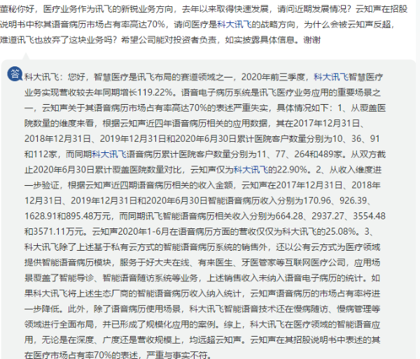 2020年云知声冲刺科创板时,因其招股书称“语音病历市场占有率高达70%”被科大讯飞质疑。科大讯飞表示语音电子病历系统是讯飞医疗业务应用的重要场景之一,云知声关于其语音病历市场占有率高达70%的表述严重失实,云知声覆盖医院数量仅为科大讯飞的22.90%,语音病历方面的营收仅为科大讯飞的25.08%。