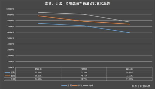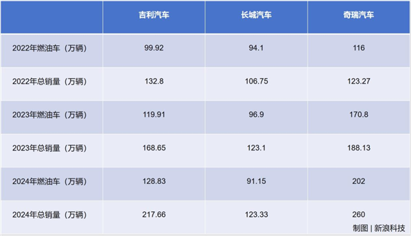因为,在这条赛道上,不仅没有比亚迪这样的供应链强敌,也能在部分细分市场继续获得用户青睐。新浪科技通过梳理2022年—2024年吉利、长城、奇瑞三家国内头部车企燃油车销量和总销量,发现尽管新能源车去年在国内市场一路高歌猛进,但对于这些车企来说,燃油车仍然是销量大头。