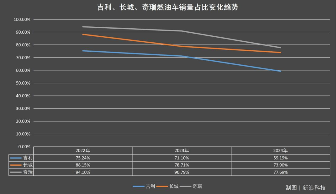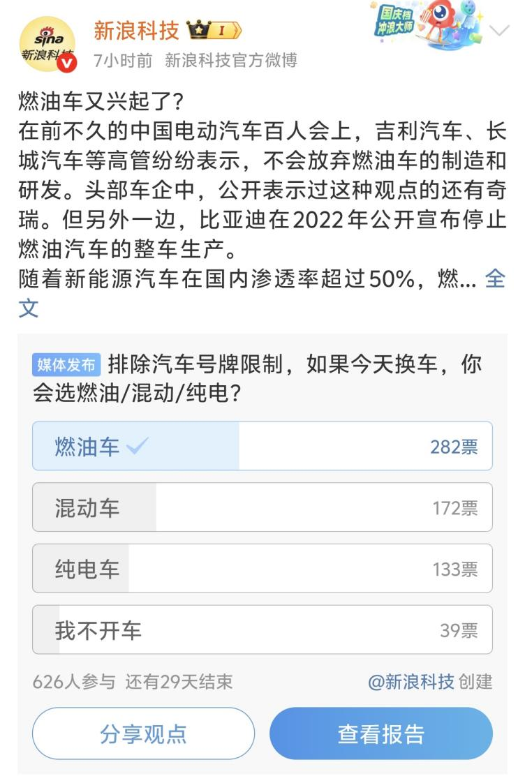 今年上海车展,新能源车无疑是“重头”。从目前的新车发布信息看,比亚迪、蔚来、理想、小鹏等品牌的新能源车型将陆续亮相,并通过各种营销赚足了眼球。但另有一批厂商,仍然在“捍卫”着燃油车的发展之路。就在车展开幕前,上汽通用总经理卢晓告诉新浪科技,未来燃油车肯定还有市场份额,至少还有25%以上。同时,不少车迷和潜在购车者,也在期待诸如新款奥迪A5L、哈弗猛龙燃油版、坦克300柴油版等燃油车型。但是,燃油车在国内的“大势”确实不容乐观——根据乘联会数据显示,中国市场3月新能源汽车渗透率达54.1%,“分水岭”已过且这一数据仍在增长。正在举行的上海车展,新能源车已经烧起了“战火”,燃油车的“保卫战”亦在同时打响。燃油车,仍是传统车企销量“大头”新能源汽车市场的快速扩张,吸引了大量资本和企业的涌入。然而,这一领域的竞争异常激烈,行业马太效应十分明显。比亚迪在宣布全面停止燃油车的同时,也宣布专注于纯电动和插电式混动两种技术,而由于其在电池全产业链的绝对控制力(从锂矿到刀片电池)、DM-i混动技术对燃油车的替代效应,从而快速降低了成本。若从数据角度来看,比亚迪2024年毛利率为21.02%,不仅高于理想(19.8%)、小米(18.5%)和特斯拉(17.9%)等一众新能源竞争对手,也高于长城(19.51%)、吉利(15.9%)和奇瑞(2024上半年毛利率14.7%)。而由此可见的是,在供应链垂直整合获得的价格优势方面,其他车企若要在价格上“拼刺刀”,将难以追赶和超过比亚迪。也正因如此,部分车企跟进比亚迪“放弃燃油车”计划时,另一些传统头部车企则“转身”投向了燃油车领域。因为,在这条赛道上,不仅没有比亚迪这样的供应链强敌,也能在部分细分市场继续获得用户青睐。新浪科技通过梳理2022年—2024年吉利、长城、奇瑞三家国内头部车企燃油车销量和总销量,发现尽管新能源车去年在国内市场一路高歌猛进,但对于这些车企来说,燃油车仍然是销量大头。数据显示,近三年,燃油车销量依然在以上三家车企中占有较大比重。2024年,燃油车在吉利总销量占比为59.19%,在长城总销量占比为73.9%,在奇瑞总销量占比为77.69%,并且,尽管各家车企燃油车占比都在降低,但销量占比仍然均超过了50%。出海驱动,它们正在布局全球燃油车如今依然在消费者购车时占有较高比重,在新浪科技发起的投票中,45%的用户认为,若没有号牌限制,自己在选购时首选会是燃油车。而在2023年中国电动汽车百人会论坛上,时任广汽集团董事长曾庆洪曾提到,尽管新能源汽车的迅猛发展带来了转型升级的喜悦,但过快的发展也伴随着隐忧。曾庆洪建议,在纯电车在整车销量占比达到50%时,希望政府有关部门研究油电同权这个课题,均衡新能源与燃油车发展节奏。实际上,政策主导也是国内车企不放弃燃油车的重要原因。2024年11月,在中国汽车工程学会年会上,工业和信息化部装备工业一司副司长郭守刚发表了一项重要声明,这一声明迅速在汽车行业内引发了广泛讨论。他强调,中国将在大力发展新能源汽车的同时,不忽视内燃机技术的进步,旨在促进传统能源汽车与内燃机制造商的协同发展。此外,郭守刚还指出,内燃机在重型运输、工程机械以及军事装备等领域具有不可替代性,其高扭矩输出、即时响应性等特性在这些领域难以被替代。郭守刚的表态,被众多业内人士视为未来汽车产业发展方向的明确信号。尽管新能源汽车的崛起势头强劲,对传统燃油车构成了不小的挑战,但工信部此次对燃油车的支持态度,却让人们看到了燃油车发展的新机遇。与比亚迪的激进不同,如今的吉利、长城、奇瑞、长安、上汽等车企,都在选择“两条腿走路”,同时,这些车企在海外燃油车销量非常可观。奇瑞2024年海外销量114.4万辆,其中燃油车占比超80%(约91.5万辆),吉利汽车燃油车仍占出口60%,主攻东欧、东南亚等价格敏感市场。坦克300/500等硬派越野车贡献超60%出口燃油车销量(约27.2万辆),在中东、澳大利亚等市场形成差异化竞争力。结语:全球竞争格局下,燃油车并非“鸡肋”当今,中国汽车正掀起一股出海热潮,从2021年超200万辆,到2022年超300万辆,2023年超400万辆,再到2024年超500万辆……中国车企不仅有比亚迪这样将新能源、纯电动汽车布局海外的车企,也有将燃油车进一步布局到海外的奇瑞、长城、吉利等车企。或许,这才是许多头部车企不愿意放弃燃油车的重要原因,正如此前奇瑞品牌营销中心总经理助理赵家臣所说:“我们不仅仅看国内,全球市场上燃油车份额85%,新能源只占15%。全球视角来看,燃油车仍然是主力市场,这是奇瑞坚持油电协同全球化布局的根本,我们在燃油车上面会持续有大投入,因为我们国际上占了大的市场需求。”另根据乘联会预计,2025年我国总体汽车出口量或将增至700万辆,同比增速约为10%;受外部环境、地缘因素影响,纯电车型出口量预计同比持平,燃油车型出口量预计将提升9%,插混车型出口量预计增长70%,燃油车型仍为出口主力。由此,对于中国车企来说,对燃油车出现截然不同的两种态度,也就不难理解。即对燃油车不抛弃不放弃的车企,本身已经获得了大量专利(自研和授权),在突破专利墙上有极大投入,此刻放弃等于前功尽弃,不如燃油车、电动车同时进击;选择放弃的,同样是精算过得失。但对于中国汽车发展而言,燃油车依然有存在的必要,尤其是在当下电动汽