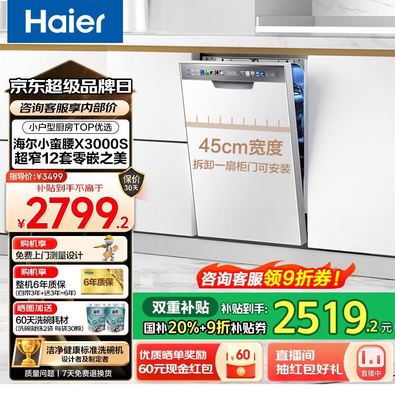 海尔小蛮腰洗碗机X3000S京东优惠价2179元