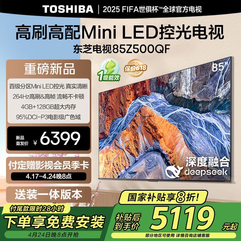 东芝电视85Z500QF,85英寸Mini LED电视,264Hz刷新率,5119元带回家