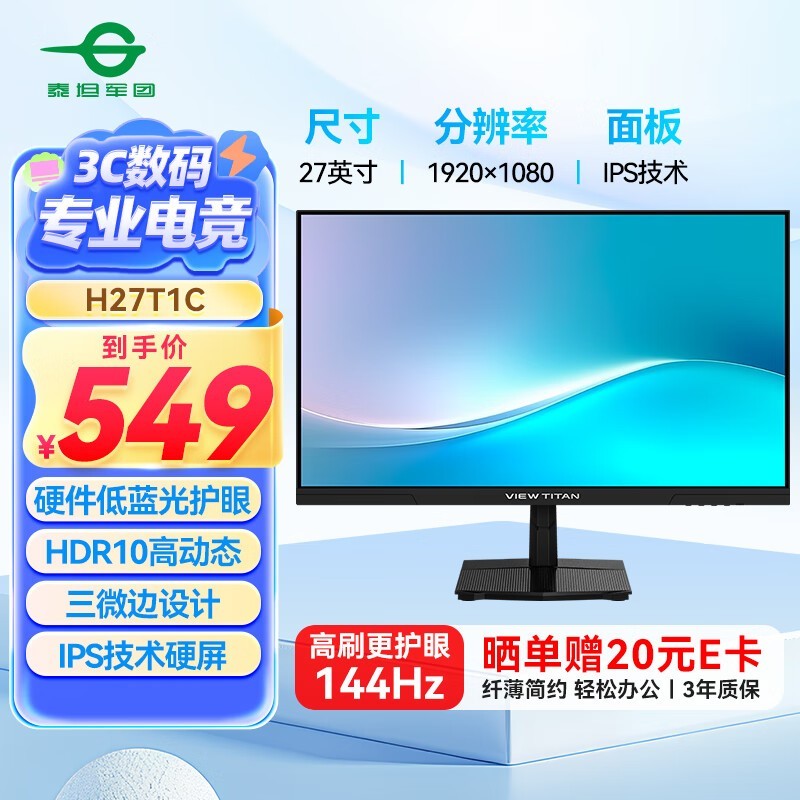 泰坦军团H27T1C显示器京东促销到手仅444元