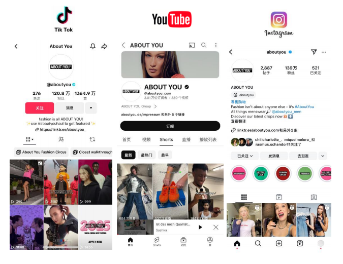 与此同时,About You还注重构建媒介矩阵,在TikTok、Youtube以及Instagram等重要营销阵地共拥有数百万粉丝,也不乏播放量破百万的爆款视频。
