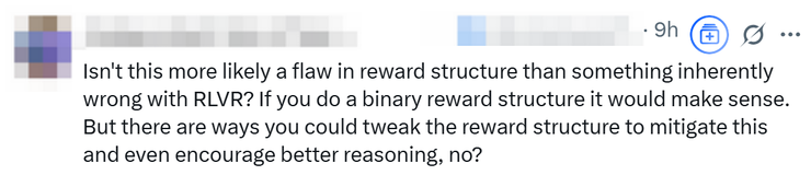 也有网友表示,这更像是奖励结构的缺陷,而非 RLVR 本身的问题。如果用二元奖励结构,出现这种情况可以理解。但我们可以调整奖励结构来缓解这个问题,甚至还能激励更好的推理。