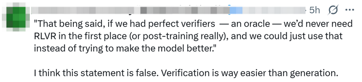 质疑声之外,RL 的追随者也在为“信仰”发声:这种说法是错的,验证远比生成简单的多。