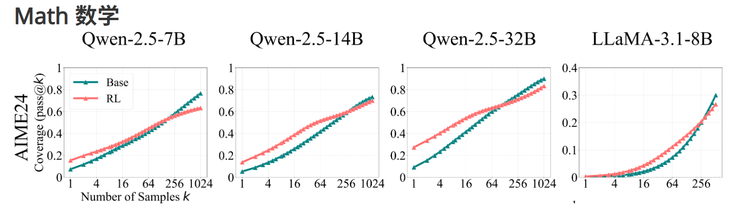 强化学习或许确实能够提升模型在已有能力基础上的输出表现(比如在低采样次数下更快给出正确答案),但这并不代表它为模型带来了新的推理路径或更复杂问题的解决能力。相反,在高采样场景中,RL 带来的“收敛性”可能牺牲了答案的多样性,从而错失了解决更多难题的机会。