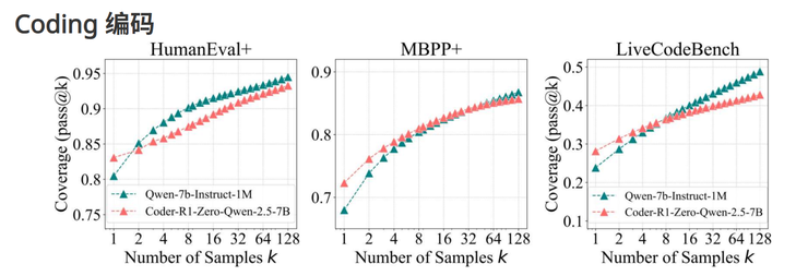 在编码任务实验中,研究团队在 LiveCodeBench、HumanEval+ 和 MBPP+ 等基准上评估了源自 Qwen2.5-7B-Instruct-1M 的 RLVR 训练模型 CodeR1-Zero-Qwen2.5-7B。他们通过 pass@k 指标来衡量性能,并根据预定义的测试用例评估模型的正确性。