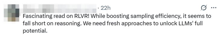 有人认为这篇文章抓住了 RL 自身的漏洞,虽然提高了采样效率,但它似乎在推理方面存在不足,未来我们需要新的方法来释放 LLM 的全部潜力。