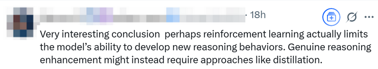 也有人表示,或许强化学习实际上限制了模型开发新推理行为的能力。真正的推理增强可能需要蒸馏等方法。
