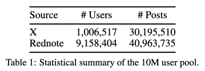 User Pools(用户池):使用来自 X 和 Rednote 等平台的历史发言构成 1000 万用户的大规模池。