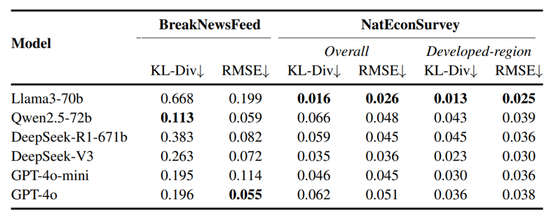 在全国经济调查中,模型需预测共八项月度消费支出。结果表明:所有模型在大多数维度上与真实数据高度一致,尤其在 “日用品” 维度表现最优。在 “住房支出” 这一复杂领域,各模型误差普遍偏大,说明 LLM 对高复杂经济行为的模拟仍具挑战。Llama3-70b 在整体表现上优于其他模型,说明其在高稳定性场景中更具优势。