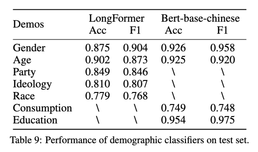 在标注器训练部分,我们采用多个大语言模型(LLM)之间多数投票的标签结果来构建训练数据集。鉴于不同平台所使用的主流语言存在差异,我们在 X 平台的数据上使用 LongFormer 模型,在 Rednote 平台的数据上使用 Bert-base-chinese 模型。最终标注器在测试集的各个人口统计学特征中的标注表现如下: