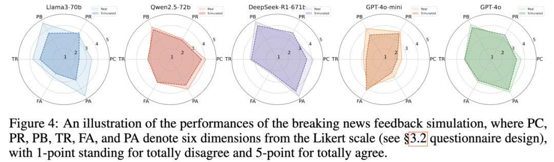 在 ChatGPT 问世事件的反馈模拟中,我们将观点问卷量化为六个维度的 1–5 分 Likert 量表,并将模拟结果与真实用户群体逐项比对。结果表明,多数模型在六个维度(公众认知 PC, 感知风险 PR, 感知利益 PB, 信任度 TR, 公平性 FA, 公众接受度 PA)上均与真实用户高度一致。同时,也需要注意,所有模型的模拟回答整体偏保守,暗示着模拟中可能存在一定由于 LLM 引入的偏差风险。