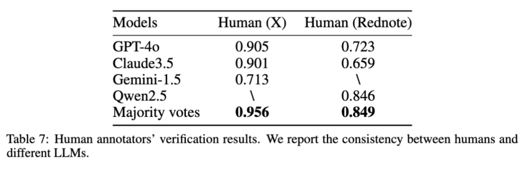 由于用户的人口统计信息无法直接获取,我们设计了一个人口属性标注系统,用于推断和标注用户特征。该流程首先由多个大语言模型作为初始标注器,对用户在多个人口统计维度上进行分类。随后,人类标注员对 LLM 生成的标签进行评估与修正,从而确保用户标签数据集的可靠性。经过人工审核后的数据集将用于训练人口属性分类器,从而以成本较低的方式支持大规模的自动标注。具体而言,我们在 15 个人口统计维度上对用户进行了标注,包括:年龄、性别、职业、收入、教育水平、居住类型、地区、就业状态、婚姻状况等以及兴趣爱好。每一项属性均由对应子数据集训练的专用分类器进行推断。在小红书和 X 数据上经过如上标注流程后,各个标注模型与人类标注的一致性如下表所示: