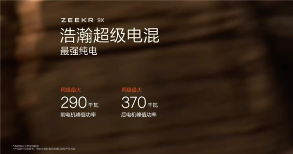 配浩瀚超级电混,2.0T超级电混发动机,拥有行业最强热效率(46%)和最高峰值功率(205千瓦),前电机峰值功率290千瓦,后电机峰值功率370千瓦,均为同级最大。
