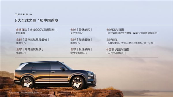 极氪9X搭载行业最强宁德时代6C骁遥电池,是全球纯电续航里程最长的电混 SUV,也是全球充电速度最快的电混SUV,SoC20%-80%只需9分钟,CLTC纯电续航里程达到380公里。