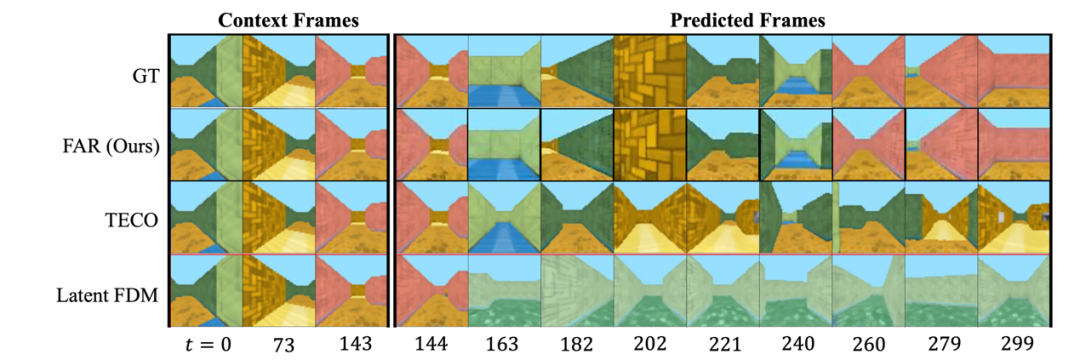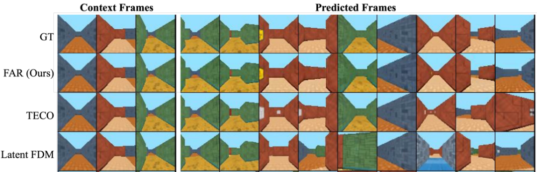 基于条件帧的视频预测的评测结果3)高效的长视频训练与长上下文建模能力:FAR 支持高效的长视频训练以及对长上下文建模。在基于 DMLab 的受控环境中进行实验时,我们观察到模型对已观测的 3D 环境具有出色的记忆能力,在后续帧预测任务中首次实现了近乎完美的长期记忆效果。