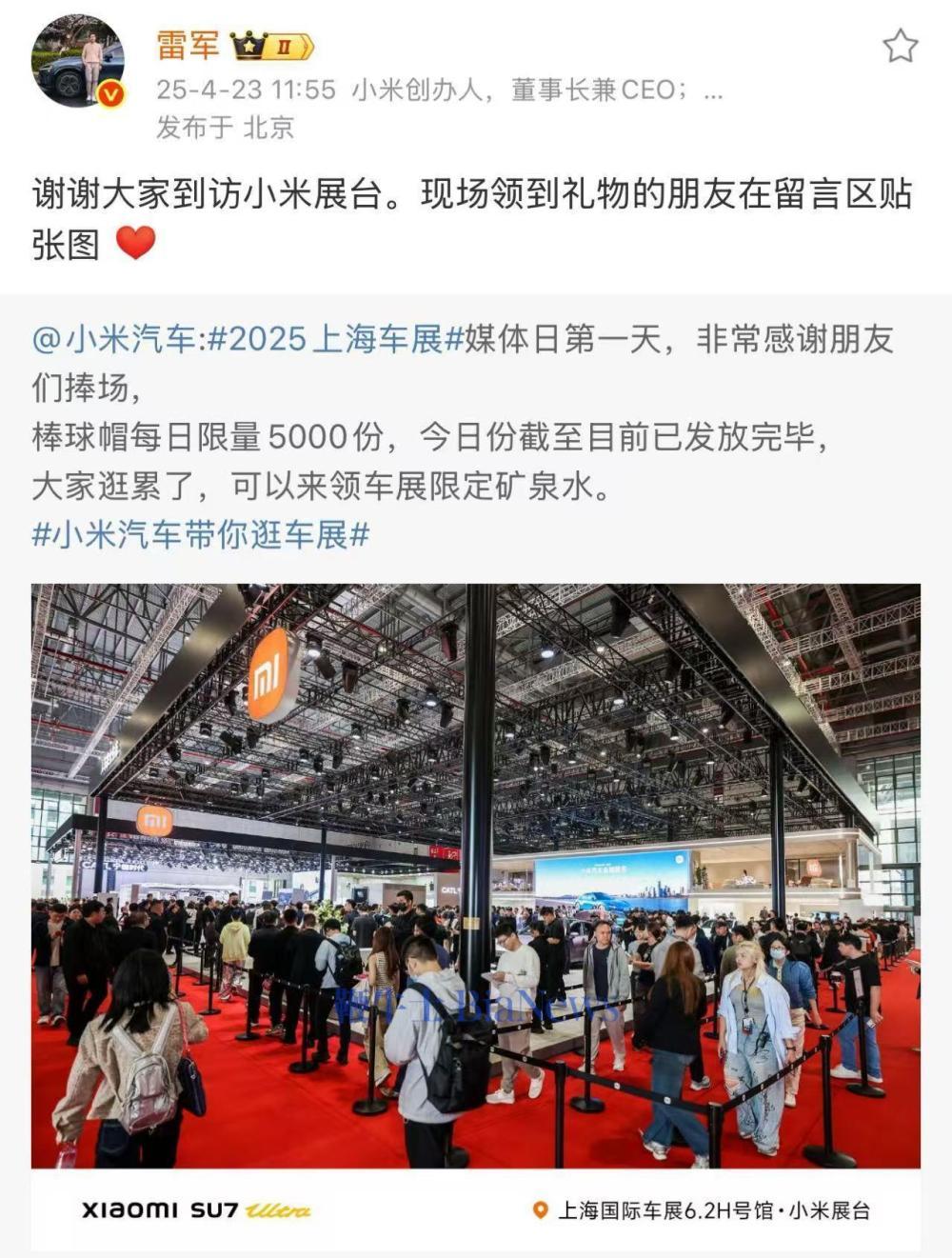小米汽车展区为参观者准备了5000份棒球帽(每日限量),目前已发放完毕,官方称“大家逛累了,可以来领车展限定矿泉水”。