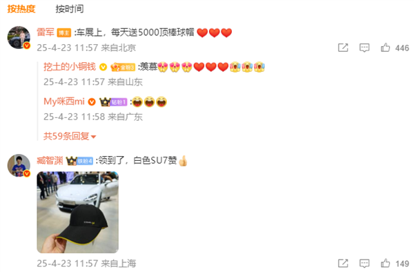 雷军在评论区第一个留言称:车展上,每天送5000顶棒球帽。