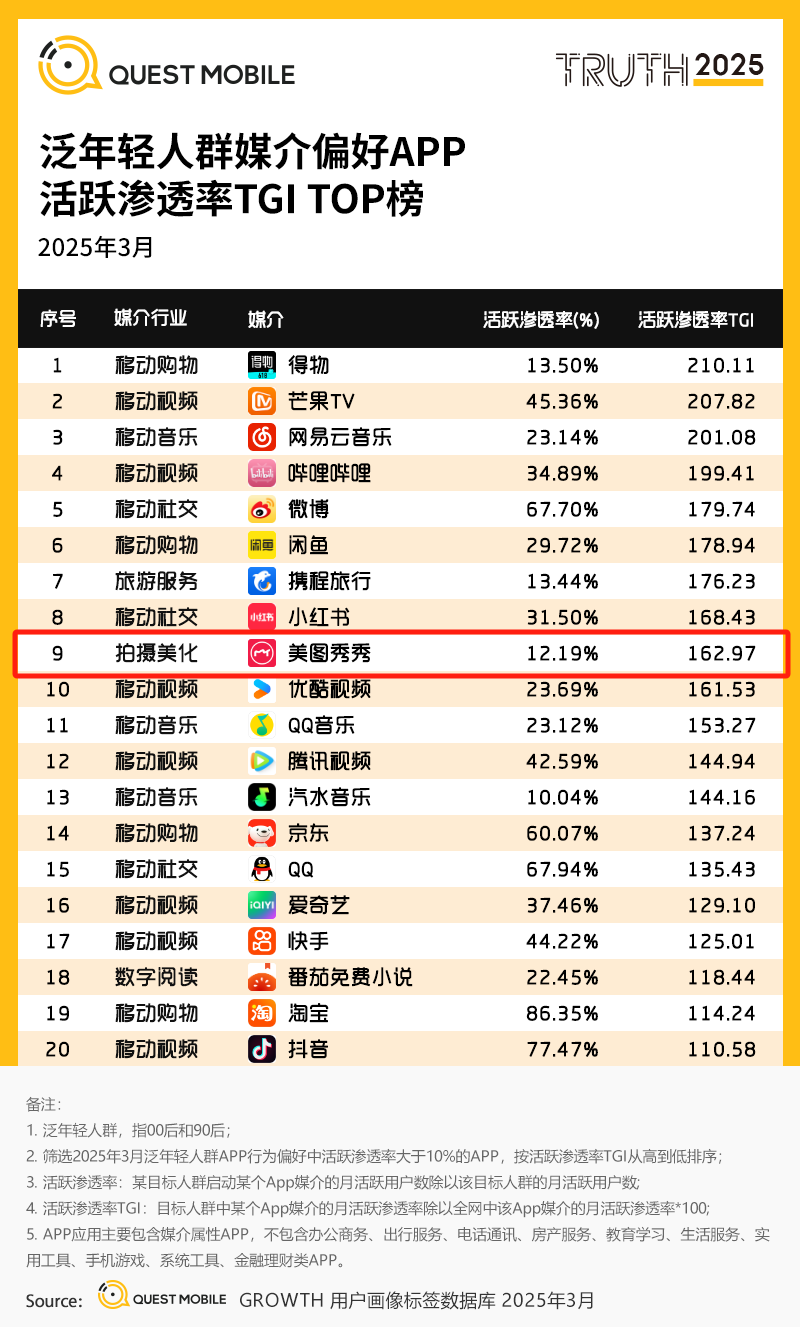 4月22日,QuestMobile发布2025年3月泛年轻人群媒介偏好APP活跃渗透率TGI TOP榜,美图公司旗下美图秀秀位居拍摄美化赛道第一。