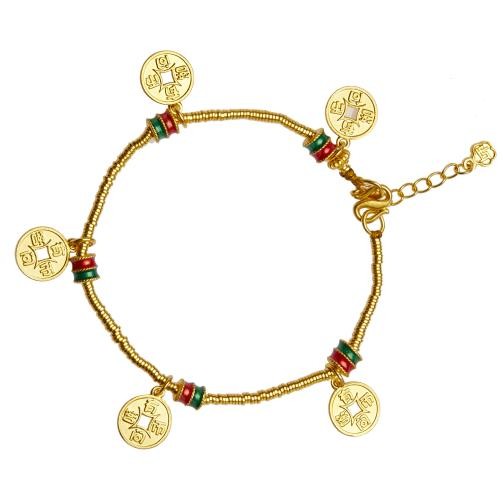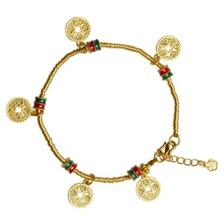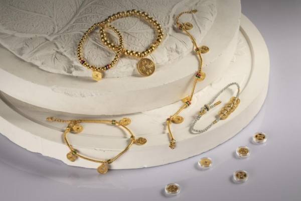 此次入围的五福聚财手链隶属于有钱花系列,由中国黄金与上海造币有限公司合作开发,以古代花钱为原型,带有兰花(春)、荷花(夏)、菊花(秋)、梅花(冬)和牡丹图案,寓意一年四季有钱花,表达富贵兴旺的美好寓意。五福聚财使用了非遗珐琅工艺,聚集了五枚钱币,也是是中国黄金国潮文化的代表之作之一。