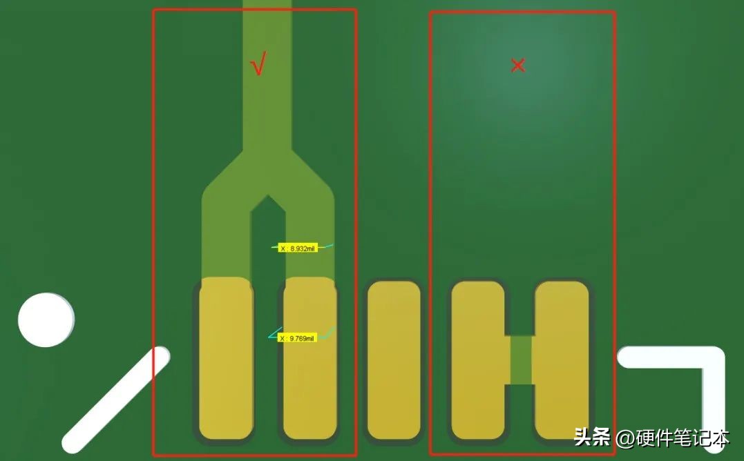 如果IC的相邻引脚需要相连,需要注意的是最好不要在焊盘上直接进行连接,而是引出在焊盘外连接,这样可以防止生产时IC的引脚连锡短接。另外相邻焊盘间引出的线宽也需要注意,最好不超过IC引脚的大小,一些特殊引脚除外如电源引脚等。