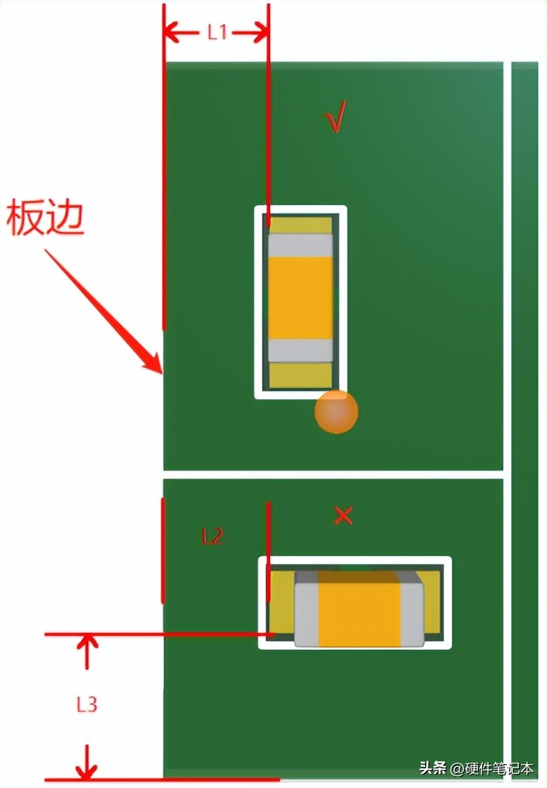 器件摆放:建议器件焊盘与拼板“V cut”方向平行,目的是使得分板时器件焊盘所承受的机械应力均匀且受力方向相同,减小焊盘脱落的可能性。
