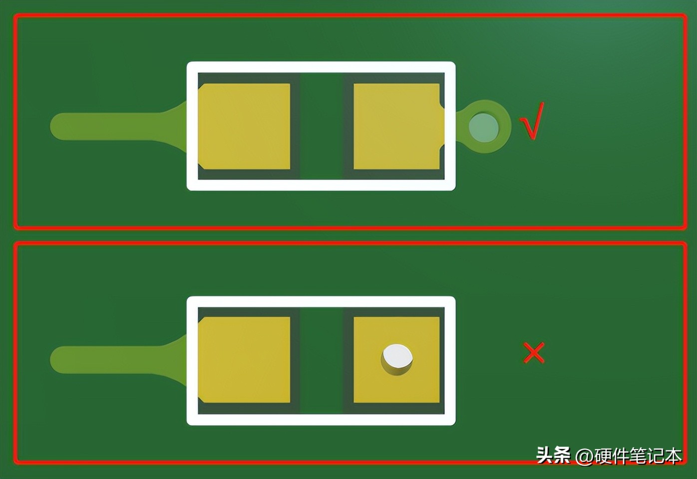 此外过孔的放置位置也同样重要,过孔如放置在焊盘上,生产时便容易导致器件焊接不良,因此一般过孔都放置在焊盘外,当然在空间极其紧张的情况下过孔放置在焊盘上再加上制板商的盘中孔工艺也是可以的,不过这样做生产成本便会增加。