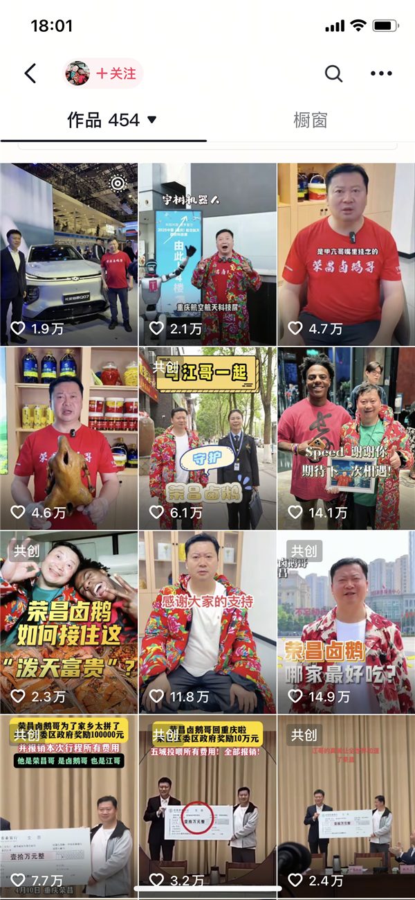 他身着标志性的大花袄,高举荣昌卤鹅,在春熙路拥挤的人群中,奋力挤到“甲亢哥”身旁,用蹩脚的英语高喊:“Speed,Speed,braised goose,eat、eat!”这一幕被记录下来并发布到网络上,迎来了巨大的流量。